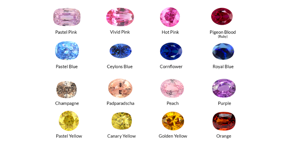 Сапфир обычно называют синим драгоценным камнем. Тем не менее, он бывает самых разных цветов и качеств, кроме красного (который является рубином). К фантазийным окраскам сапфиров относятся жёлтые, оранжевые, зелёные, бесцветные, розовые, голубые, фиолетовые, а также сапфиры других цветов. В целом, чем насыщеннее и однороднее цвет, тем дороже камень.