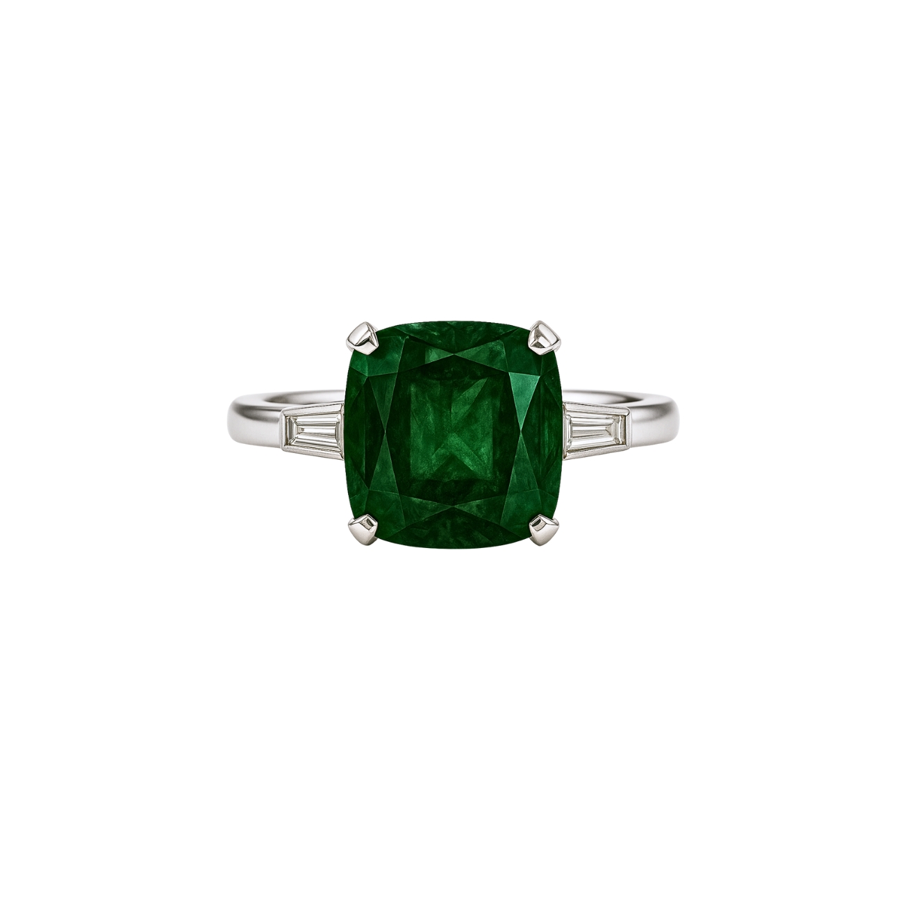 • Чистота: изумруд — умеренное масло (F2); бриллиант — VS — в бриллиантах есть небольшие включения, которые заметны только в лупу с 10x увеличением, без лупы бриллианты визуально чистые